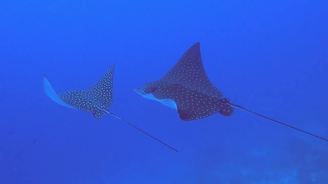 A video of a Spotted Eagle Ray encounter at Canyon Reef dive site off of Roatan, Honduras.